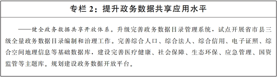 (三)健全政務數據共享體系。圍繞“高效辦成一件事”,推動以查詢、核驗、批量交換等多元化方式開展政務數據共享,建立跨層級、跨地域、跨系統、跨部門、跨業務政務數據共享和業務協同體系,擴大政務數據共享交換覆蓋范圍。升級完善省、市政務數據共享交換平臺,加速推進縣域政務數據匯集,強化國家、省、市三級政務數據共享交換平臺聯動,推進跨層級政務數據回流。建立跨系統信息共享機制,推動省級部門信息系統和省數據共享交換平臺數據庫互通共享。推動主動共享與按需共享相結合,定期發布政務數據共享責任清單。