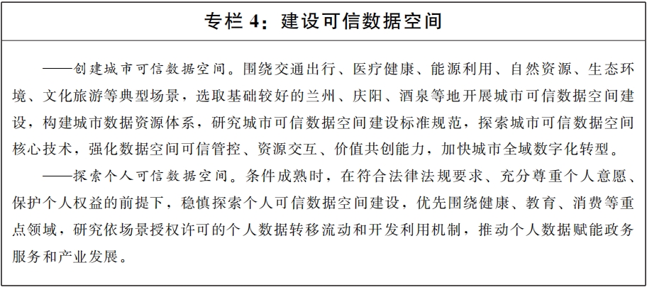 (十一)建設公共數據流通利用基礎設施。根據國家政策文件規定,探索城市、個人等可信數據空間建設,鼓勵建設數聯網、數據元件等數據流通基礎設施,促進數據高效便利可信流通。圍繞工業制造、現代農業、醫療健康、綠色低碳等重點行業領域,探索數據基礎設施技術路線試驗,為國家數據基礎設施建設貢獻“甘肅方案”。推動省內數據基礎設施規則、管理、標準相通相容,促進跨區域跨層級設施互聯、能力互通,實現數據利用方式向共享匯聚和應用服務能力并重的方向轉變。