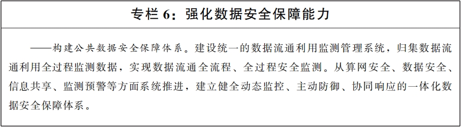 (十八)構建公共數據安全保障體系。加強對涉及國家安全、商業秘密、個人隱私等數據的保護。建立健全公共數據資源開發利用安全風險識別評估、監測預警、應急處置等數據安全規范體系,明確數據資源生產、加工使用、產品開發及經營等全過程相關主體安全責任,開展事前、事中、事后業務規范性審查和監督管理。加強數據安全聯管聯治,嚴厲打擊非法獲取、出售或提供數據的黑灰產業,嚴禁超出授權范圍使用數據,嚴格管控未依法依規公開的原始公共數據直接進入市場。