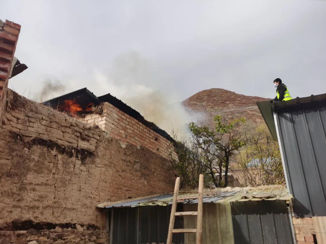 10月30日下午3點,交通監(jiān)理公司負責幫扶的臨潭縣洮濱鎮(zhèn)馬旦溝村一戶村民家中突然冒出滾滾濃煙,火光在濃煙中忽隱忽現(xiàn)。著火是一座磚木結(jié)構(gòu)彩鋼屋頂?shù)男路浚饛奈蓓敓穑綗酵V鸬姆课菖赃叾逊胖嗄甑睦喜窕穑稍锂惓#唤z火星就能點燃,而與著火點緊鄰著的就是布局緊密的鄉(xiāng)親們的房屋,再往外圍則緊接著山林,如果火勢蔓延,后果將不堪設(shè)想。
