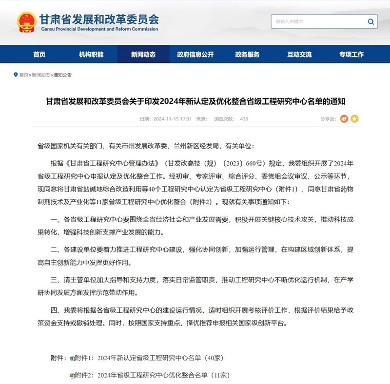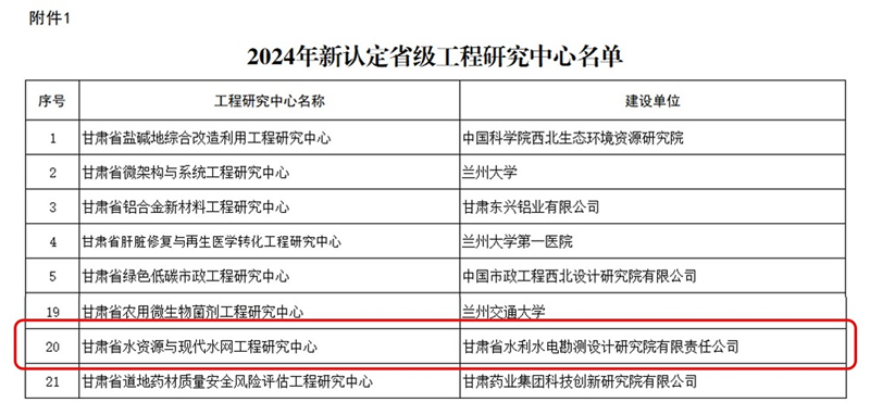 近日,省發展和改革委員會公布《2024年新認定及優化整合省級工程研究中心名單》,省水電設計院申報的“甘肅省水資源與現代水網”成功獲批立項“省級工程研究中心”,標志著公司在水利工程科研平臺建設方面取得了重大突破。